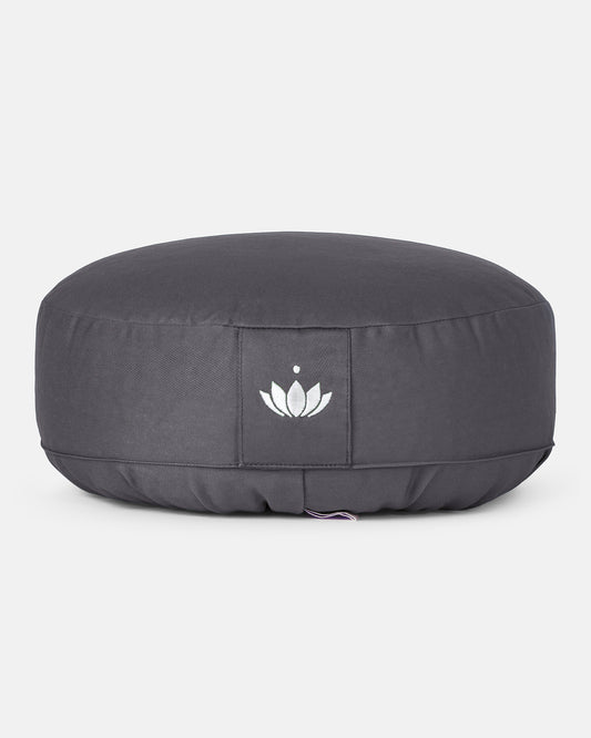 The meditation cushion classic, extra low, made of robust organic fabric, with sewn-in lotus embroidery on the handle, the versatile seat for flexible and advanced users.