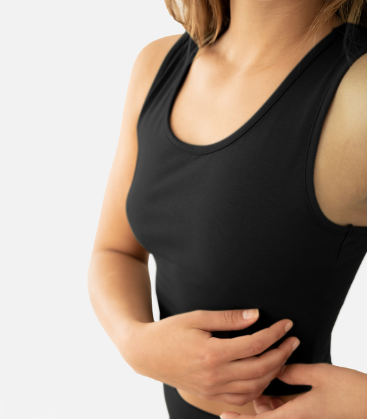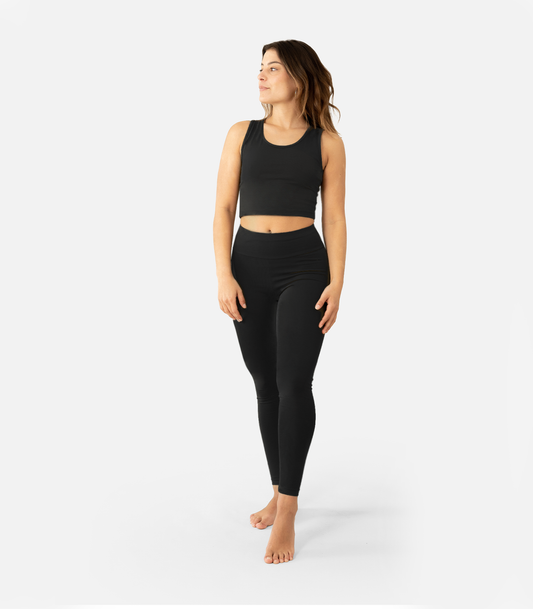 The wide straps guarantee maximum freedom of movement for your arms and a secure wearing feeling during your practice. With its tight fit, it ends at belly button height and can therefore be perfectly combined with our high-waist trousers.