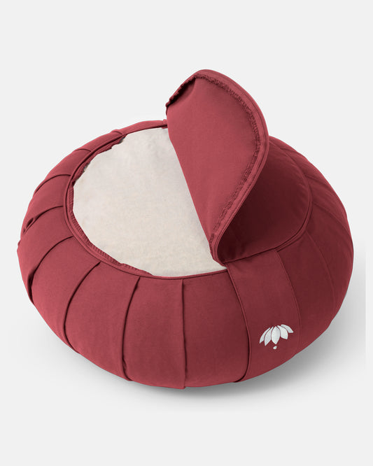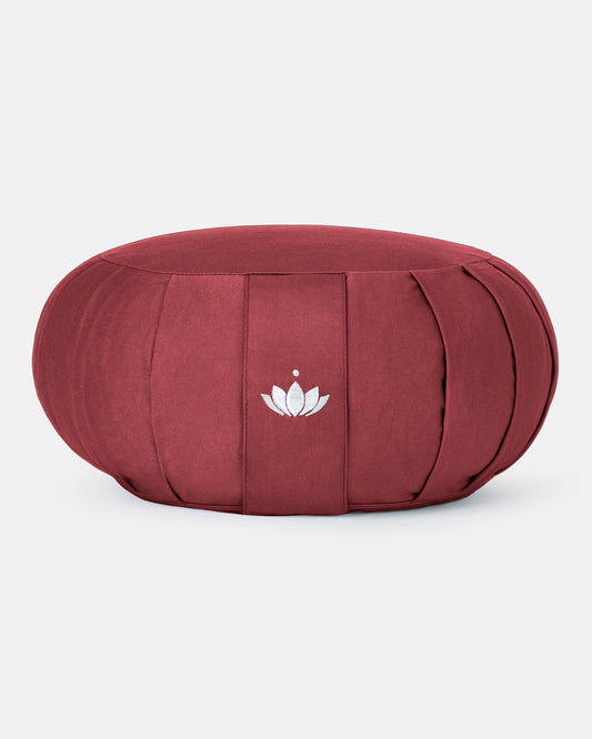 The Zafu meditation cushion in classic design with stretch pleats and sewn-in lotus embroidery on the handle.