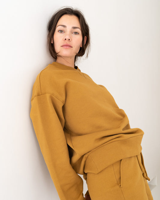 Lässige, oversized Passform mit Rundhalsausschnitt und elastischen Bündchen an Ärmel und Saum. Passend für den Alltag, einen gemütlichen Abend oder auf dem Weg ins Yogastudio.