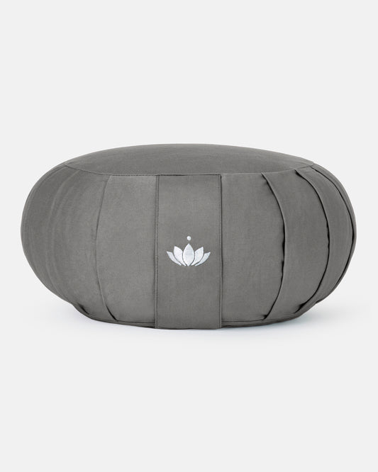 Das Zafu-Meditationskissen im klassischem Design mit Dehnfalten und eingenähter Lotus-Bestickung am Haltegriff.